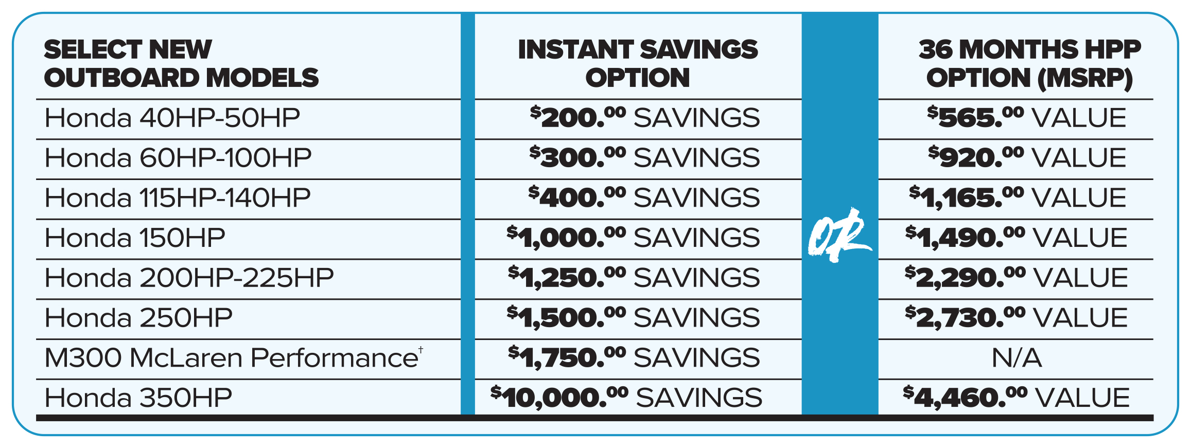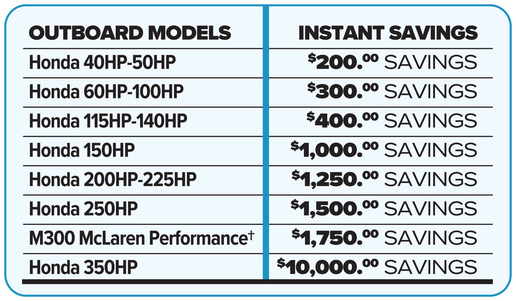 *At participating Honda Marine dealers only. Qualified retail customers may receive savings off the selling price of a Honda powered boat package or Honda Marine engine(s) sold for repower. This promotion is limited to new Honda Marine BF40–BF350 outboard engines, 2021 and newer models, in stock, sold and delivered between January 5, 2026, and March 30, 2026, delivered to a US resident. May be combined with certain other promotions. Only Honda Marine outboard engines sold for personal use qualify for this promotion. Fleet, rental, commercial, and government sales, demo engines, and engines sold under special pricing/promotions including (but not limited to) guides, brand ambassadors, and tournament fishermen are ineligible. Dealers set their own pricing. Actual contract coverages, limitations, and exclusions may vary. HondaCare Protection Plan® not available in South Carolina. 36-month HondaCare Protection Plan® does not apply to the M300 model. Honda Marine reserves the right to modify, amend, cancel or revoke, in whole or in part, this promotion at any time without prior notice. All Honda outboards meet EPA and CARB emission levels. Always wear a personal flotation device while boating and read your owner’s manual.